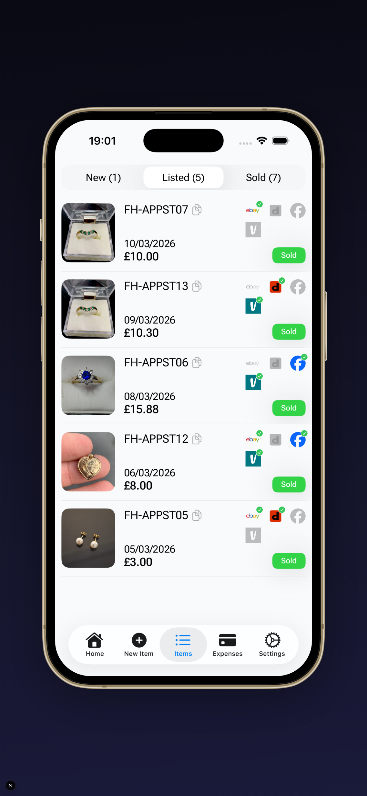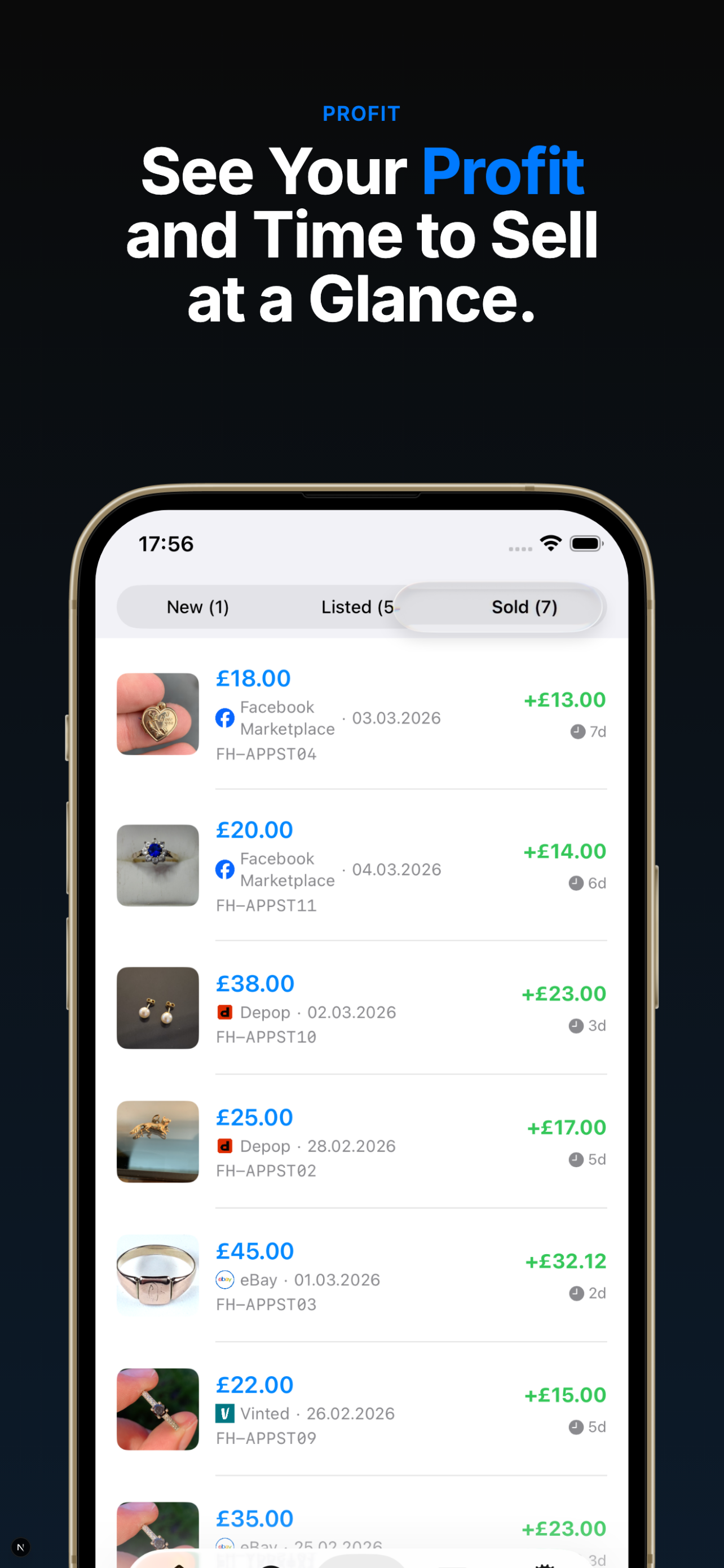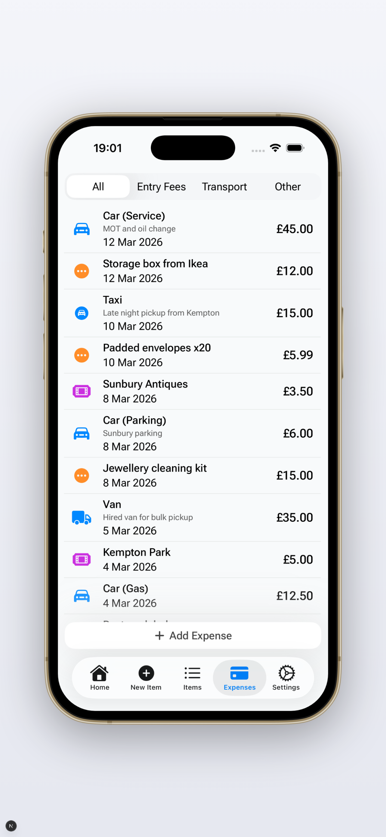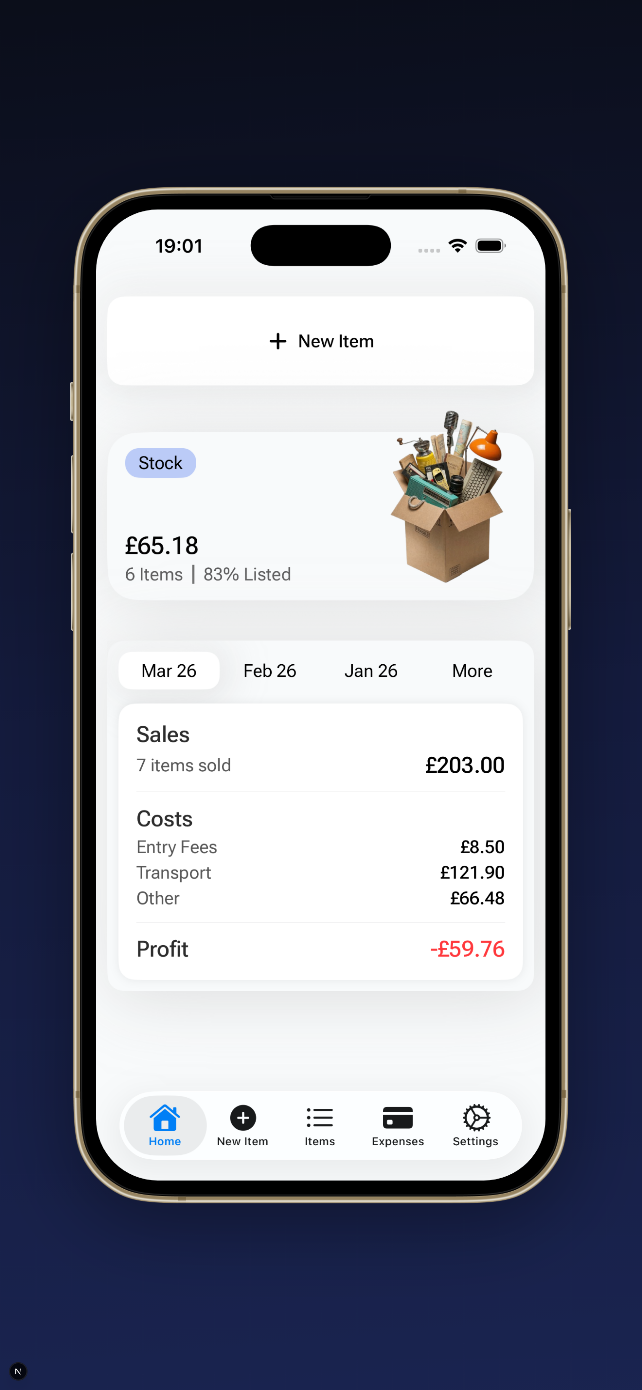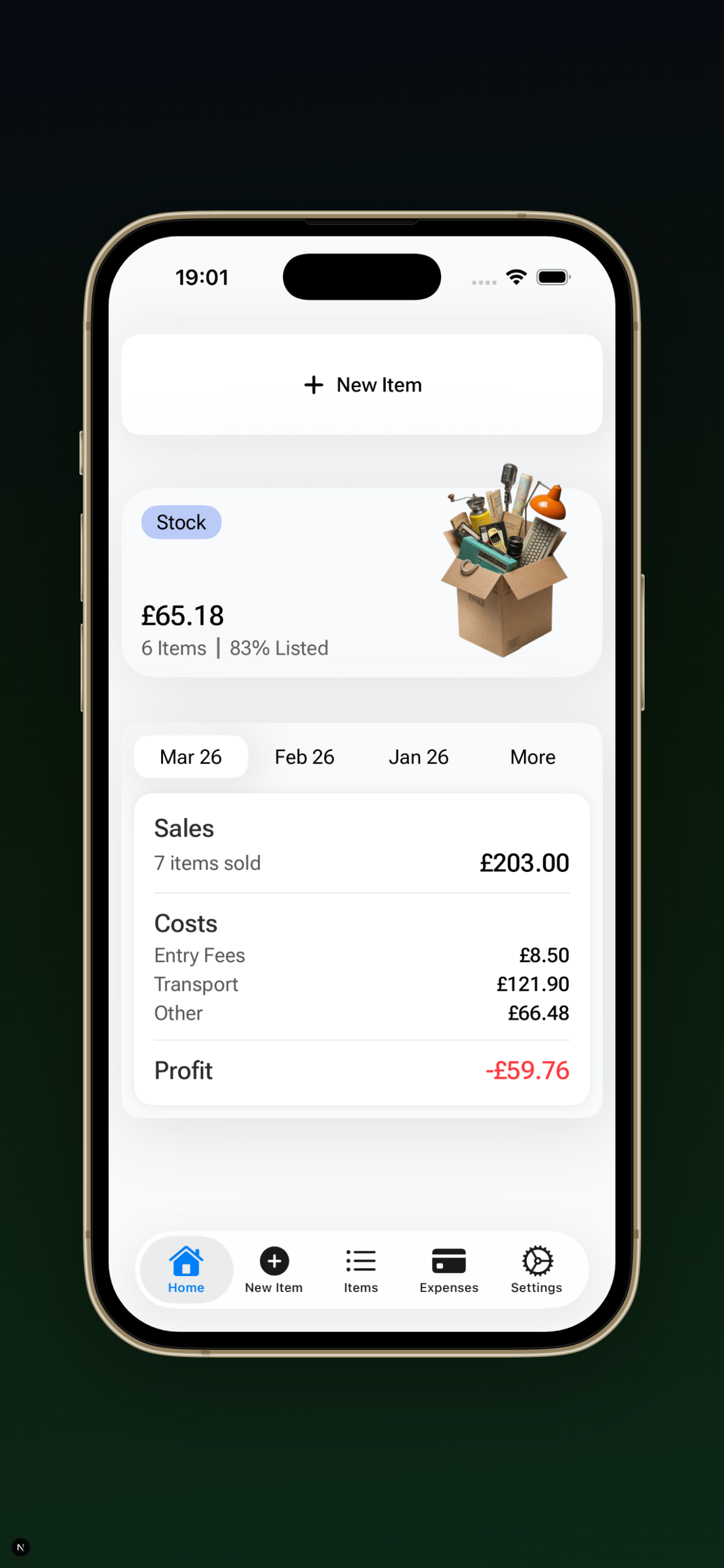FlipperHelper is a free iOS app for people who buy secondhand items at car boot sales, charity shops, and flea markets, then resell them on platforms like eBay, Vinted, and Facebook Marketplace. It tracks every item from purchase through listing to sale and calculates your real profit after all expenses.